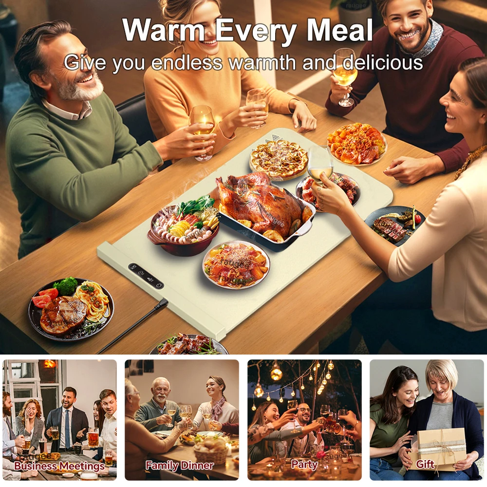 This foldable electric food warmer mat keeps your meals evenly warm without bulky trays, open flames, or constant reheating, perfect for family dinners, holidays, and entertaining.